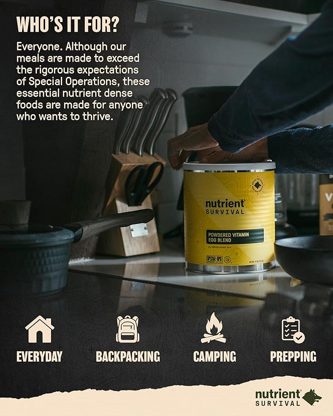 - FEED YOUR FREEDOM: Jump-start your day with Nutrient Survival Vitamin Egg Blend Powder. Just add water to get your powdered eggs ready to be used directly on the stove or in your favorite recipe. Nutrient dense, equivalent to 70 whole eggs per can