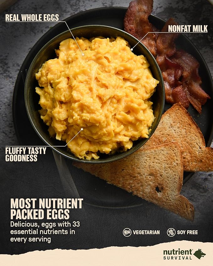 - SPECIAL OPS GRADE NUTRITION: Our soy & gluten free whole egg powder is made with real eggs, and is packed with 33 nutrients in each serving. These freeze dried eggs are a staple survival food for every prepper’s pantry