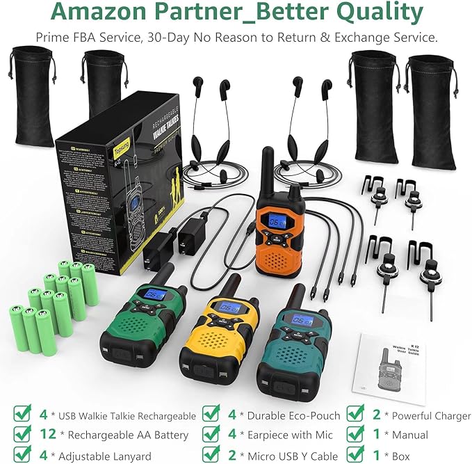 - Included Components : 4 * Original Earpiece and Mic Sets, 2 * Fast Chargers & 2-in-1 Cables, 4 * Multi-purpose Walkie Talkies Long Range, 4 * Belt Clips & Lanyards & Pouches, 4 * 4500mAh AA Batteries Rechargeable 4 * Original Earpiece and Mic Sets, 2 * Fast Chargers & 2-in-1 Cables, 4 * Multi-purpose Walkie Talkies Long Range, 4 * Belt Clips & Lanyards & Pouches, 4 * 4500mAh AA Batteries Rechargeable