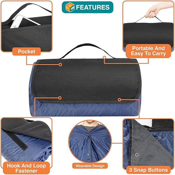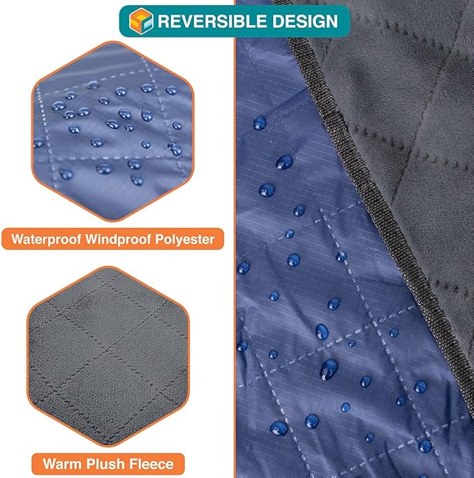 - 100% WATERPROOF AND WINDPROOF: This waterproof blanket outdoor has soft fleece on one side and waterproof taffeta polyester fabric on the back, keeping you dry as a picnic outdoor blanket This windproof stadium blanket can also be wrapped around you and your friends in wet cold weather. Perfect for camping, beach, sports, concert, festivals, hiking, road trips, car and even as a boat blanket!