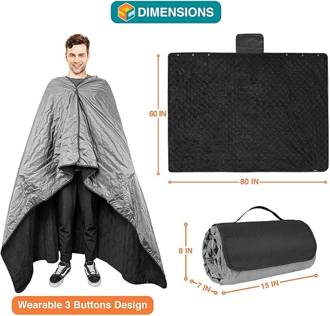 • REVERSIBLE AND WEARABLE: This sports blanket is reversible and the fleece blanket can be transformed into a waterproof poncho stadium blanket with our 3-button design to keep you cozy and dry at any sports game or festival. Big enough to share with a friend!