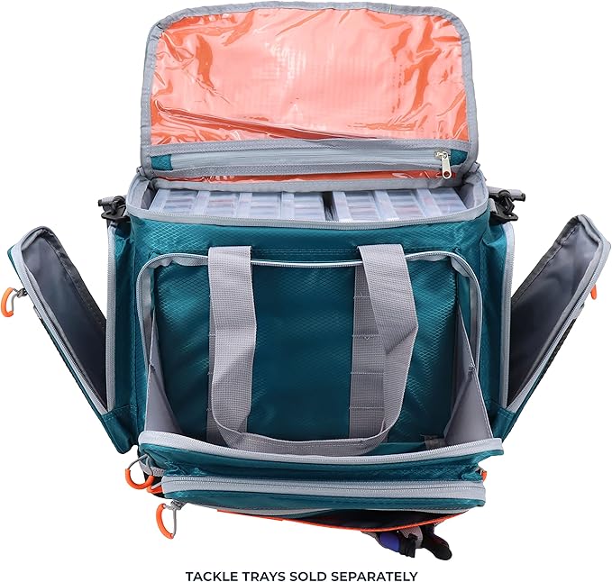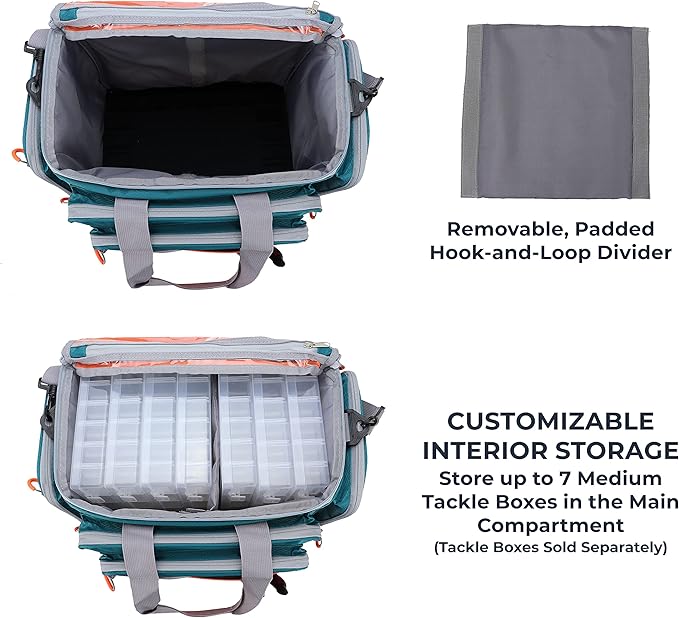 - CONVENIENT ORGANIZER - Customize the main compartment with a removable hook-and-loop divider. Store additional tackle in the clear interior pocket or in the 11 exterior rubber mesh and zippered pockets