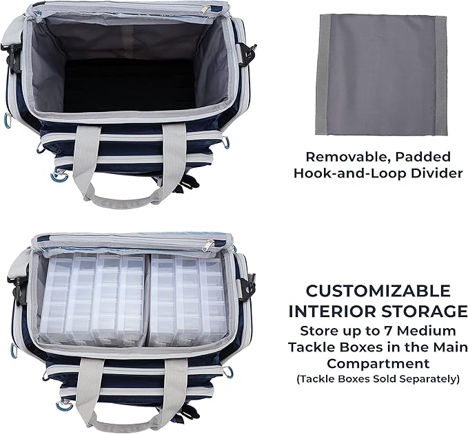 • COMFORTABLE - The removable padded shoulder strap offers comfort when carrying the large fishing tackle bag. Use the padded carry handle when transporting the saltwater tackle bag during short distances