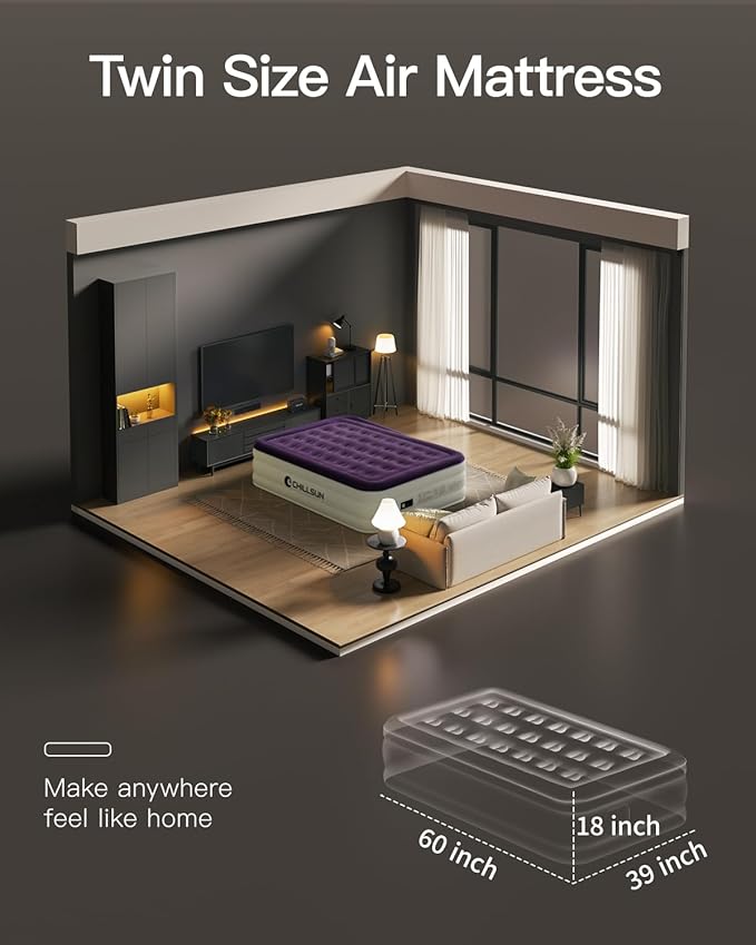 - Waterproof and Durable: Constructed with multiple layers, including 0.4mm PVC leak-proof material and a 0.2mm waterproof flocked top layer; this design for CHILLSUN 18" twin air mattress with built in pump raised resists punctures and ensures durability