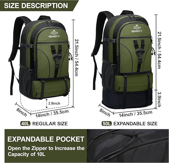 - Expandable & Extra Large Capacity: SEMSTY hiking backpack can be expanded by using the zipper at the bottom (from 40L to 50L). Roomy enough for a CARRY ON. The side buckles make your stuffs safe and make the backpack not too bulged even it's fully packed. Multi-compartments can hold everything you need in travels, such as phone, bottles, umbrella or camping supplies etc. You can easily organize all your essential stuffs. An outdoor backpack perfect for hiking, camping and travel