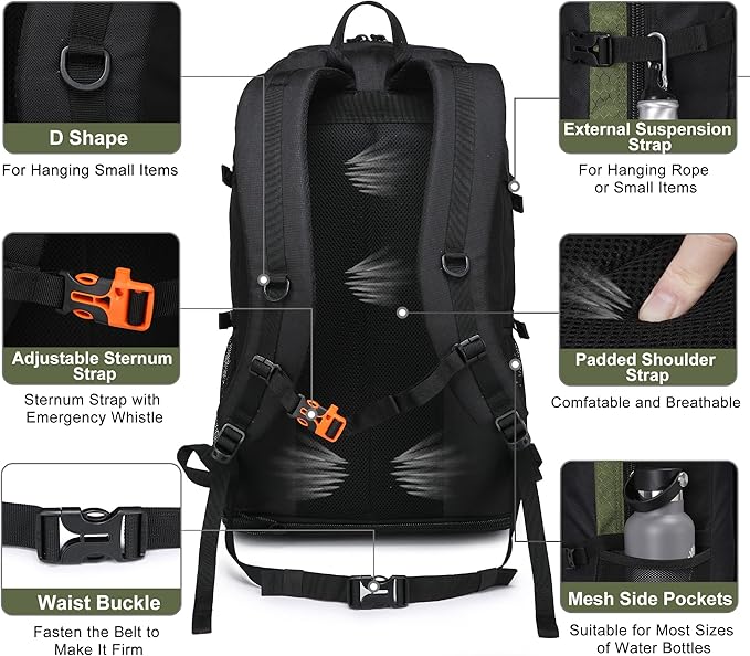 - Daypack: Easy to carry:The 40L hiking backpack is lightweight and it’s breathable mesh shoulder straps with plentiful sponge padding help to relieve the stress from your shoulder. The large capacity of 40L provides enough space for outdoor travel,camping,hiking and fishing. It meets size requirements for most airlines. This camping backpack can be used as hiking backpack, travel bags and backpacking backpack,which is suitable for men and women
