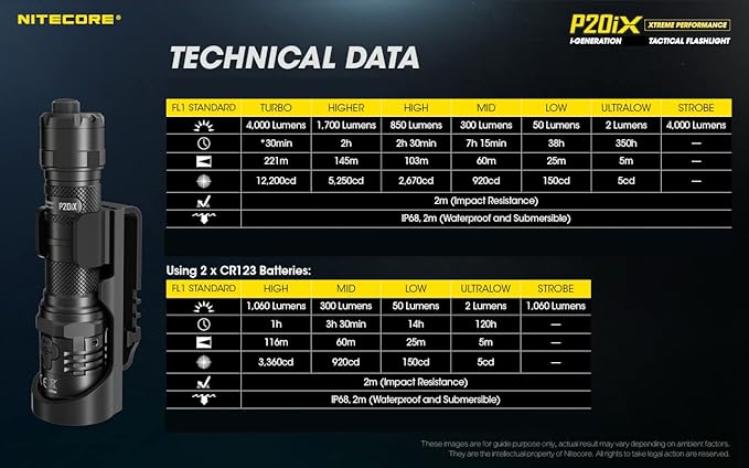 - HIGH LUMEN TACTICAL FLASHLIGHT- The Nitecore P20iX bursts out 4000 lumen light that can reach up to 241 yards. Easy to operate with 4 brightness levels, and a strong glass-breaking bezel for emergencies.