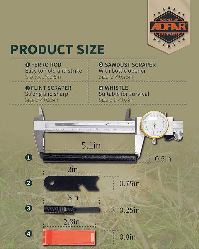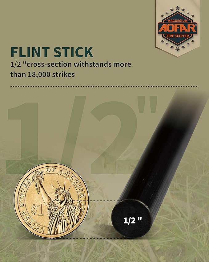 - Flint Rod Size—Length:5.1”,Diameter: 1/2".Outstanding size allows it to withstand more than 18,000 uses. The material is also strong and durable