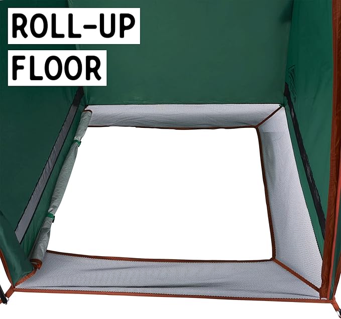 - STURDY + SIMPLE: 4 sturdy steel poles with central hub provide a robust frame, large single door entry, mesh ceiling for ventilation and side windows can be opened for extra breeze on the knees. Free standing design