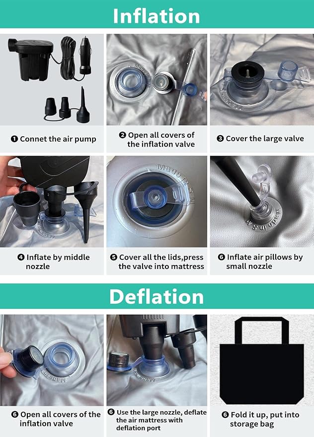 - For Campers & Long-Haul Drivers: This car air mattress is made with decent PVC and a thickened flocking surface, designed to withstand air pressure and provide lasting comfort during long trips or camping. It includes an electric air pump which cord length is 65" and three nozzles for quick and easy inflation & deflation, making it versatile for various inflatable products