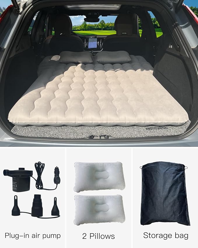 - For Campers & Long-Haul Drivers: This car air mattress is made with decent PVC and a thickened flocking surface, designed to withstand air pressure and provide lasting comfort during long trips or camping. It includes an electric air pump which cord length is 65" and three nozzles for quick and easy inflation & deflation, making it versatile for various inflatable products