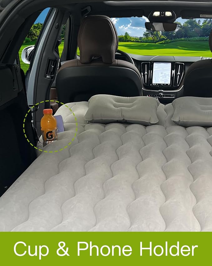 - Convenient Holders: Designed with built-in cup and phone holder, Canodoky car mattress allows you to keep drinks and your phone within reach while lying down. Enjoy hands-free convenience and prevent your phone from getting lost,PVC material covered-waterproof, two pillows for nice sleeping