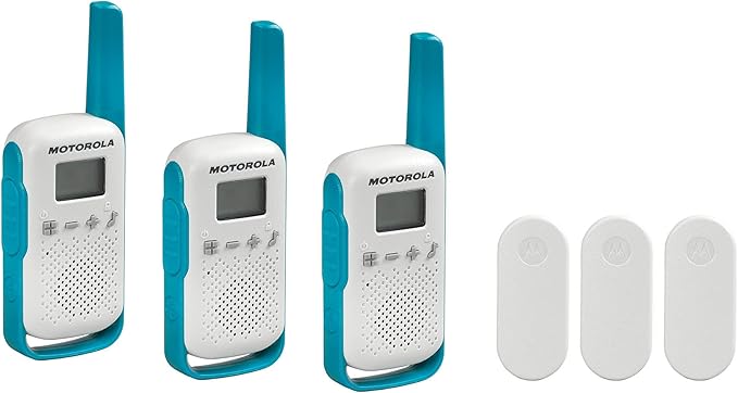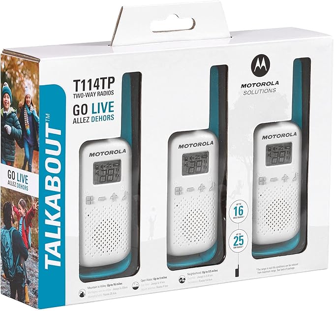 Motorola Solutions, Portable FRS, T114TP, Talkabout, Two-Way Radios, Battery Operated, 22 Channel, 16 Mile, White/Blue, 3 Pack