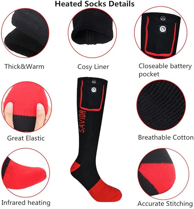 - BETTER PRODUCTS AND SERVICES: SAVIOR HEAT has been focusing on electric heating products for more than 10 years,with a deep technical background, and it has won wide acclaim from our customers.We attach great importance to the user's experience according to the latest market research results of electric socks.We upgrade the product in design and material,to prevent the problems "toe not hot,uncomfort,short life"and other quality problems.