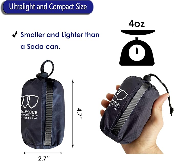 - WEIGHS ONLY [4 OZ] AND PACKS DOWN TO SMALLER THAN A SODA CAN - PERFECT FOR A BACKPACKING Pillow! No worrying about the room in your backpack with this very convenient ultralight inflatable travel pillow. Inflated size for this camping travel pillow is 17.3in (L) x 11in (W) x 4in (H)