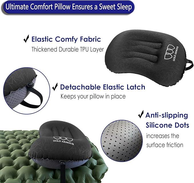 - STAYS IN PLACE THROUGHOUT THE NIGHT – Our travel pillow is durable, rugged material features anti-slip rubber dots to enhance friction against any sleep surface. This set also includes removable latch strap for attaching to inflatable pad