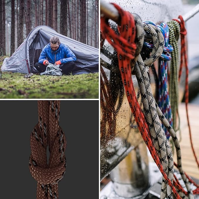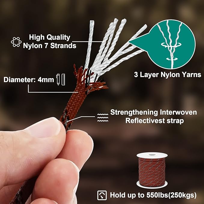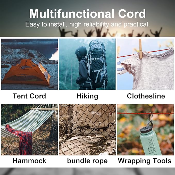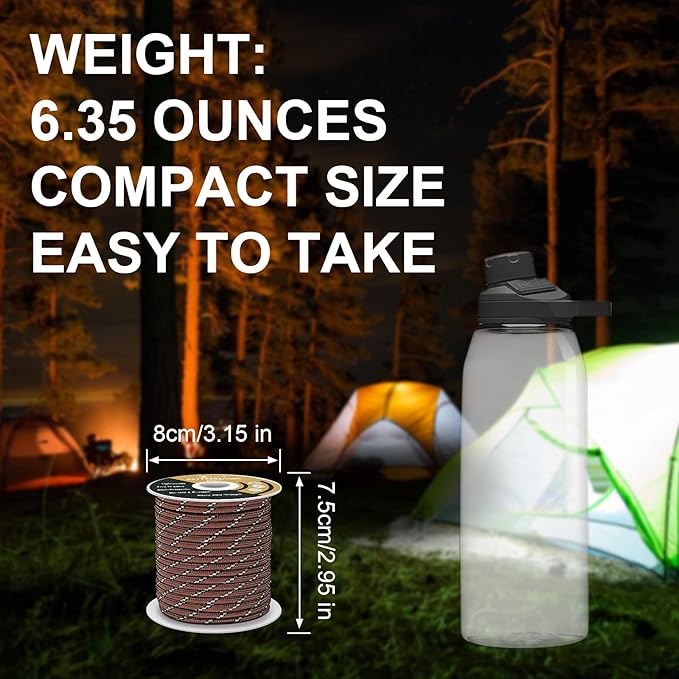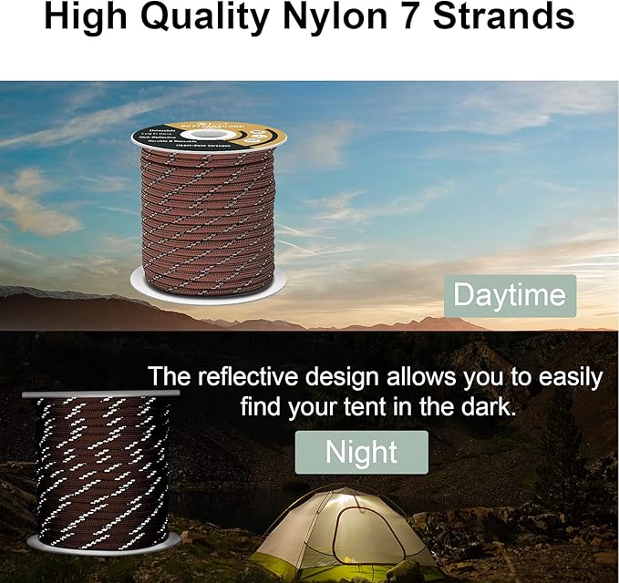 - 【REFLECTIVE EFFECT】 Differest from other cords, this paracord has a reflective strand that runs the entire length of the cord, which is highly visible and super reflective. No more tripping on guylines! Easily find your tent in the campsite even in the dark. Our tent rope is a perfect choice at night or in any emergency.