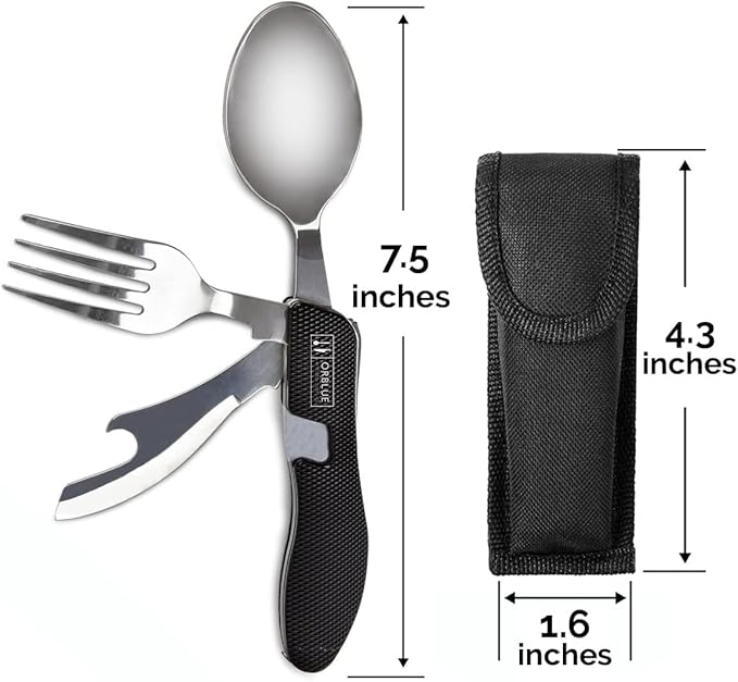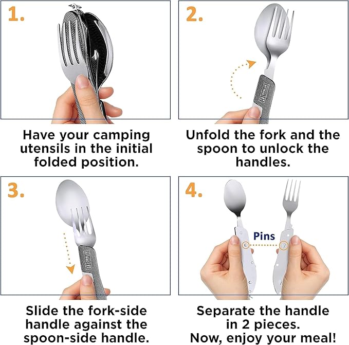 - 🍴 DINNER ESSENTIALS IN YOUR POCKET - Make eating out in the wild simple. This camping flatware tool lets you easily scoop, cut, and spear your meals. Plus, it fits perfectly in your pack or pocket.