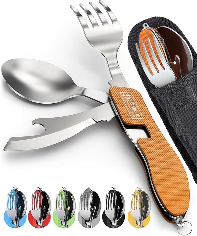Orblue 4-in-1 Camping Utensils, 2-Pack - Portable Stainless Steel Spoon, Fork, Knife & Bottle Opener Combo Set - Travel, Backpacking Cutlery Multitool, Orange