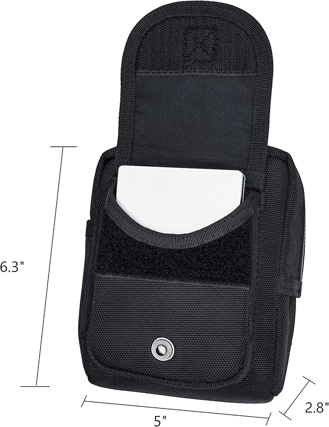 - Standard size: 5"(L) x 2.8"(W) x 6.3"(H). Weight:0.4lb / 190g. Fits up to 6.1" mobile phones. Made of 1680D nylon double-stranded Oxford cloth and double-layer PU coating to make the bag three-dimensional, with higher wear re sistance and better water re sistance. Note: Our logo on the front of pouch is attached to the Velcro tape inside, which can be torn off and you can apply your own patch or badge.