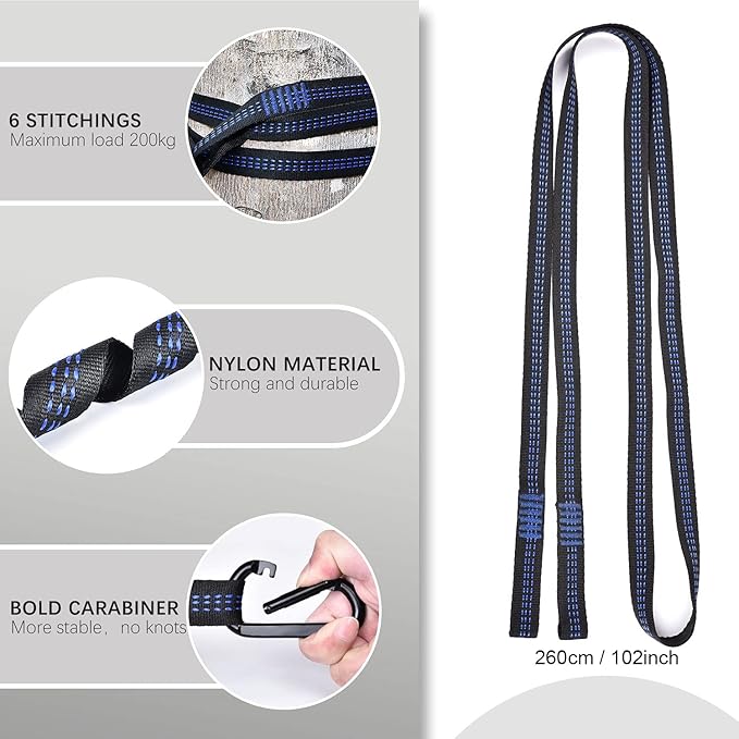 - 【Various Accessories】Various accessories meet your needs, easy to install. Automatic quick-open design, with upgraded D-shape carabiner, 102 inch tree straps and other accessories, superior easy to install and enjoy it, no need to knot, complete installation in seconds.