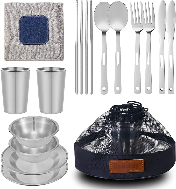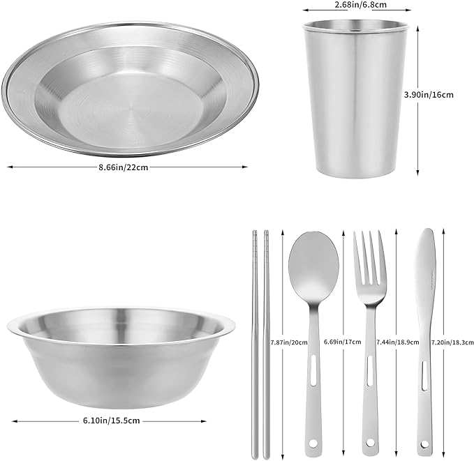 - A COMPLETE SET WITH EVERYTHING YOU NEED - Haplululy 2 Person Dinnerware Mess Kit set includes 8.5" dinner plate(2pcs) + 10 oz cup(2pcs) + 6" bowl(2pcs) + 7" spoon(2pcs) + 7" fork(2pcs) + 7" knife(2pcs) +7" chopsticks(1pcs) + Mesh Bag.