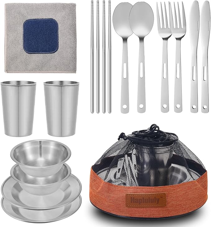 - A COMPLETE SET WITH EVERYTHING YOU NEED - Haplululy 2 Person Dinnerware Mess Kit set includes 8.5" dinner plate(2pcs) + 10 oz cup(2pcs) + 6" bowl(2pcs) + 7" spoon(2pcs) + 7" fork(2pcs) + 7" knife(2pcs) +7" chopsticks(1pcs) + Mesh Bag.