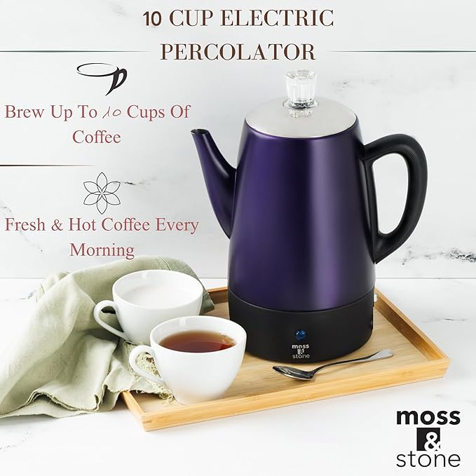 Moss & Stone Percolator Coffee Pot Electric 10 Cup, Stainless Steel Purple Coffee Maker, Coffee Percolator Electric With Keep Warm Function, 10 Cups Stainless Steel Percolator With Coffee Basket