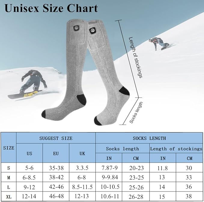 - AFTER-SALES WORRY-FREE: The heated socks contains 4 sizes of S-XL,which can be worn by adults and teenagers.Please fully charge it before using it for the first time (about 3.5 hours).All purchases of our products are provided with a free one-year quality guarantee.For any quality or use problems,please contact us through the Amazon"Contact Seller"channel,we will solve your problem in time,we have an after-sales service center in the United States,please rest assured to buy.