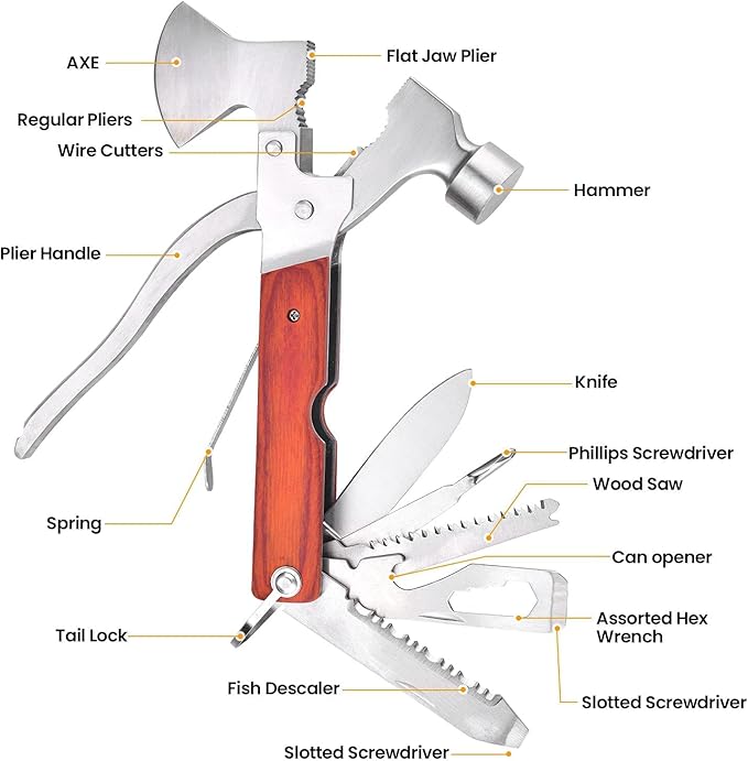 - 【WELL-MADE】 This multi-functional travel tool for men and women has a durable steel head and a solid and durable colored wooden handle. It is strong enough to cut, pry, screw, open fire hydrants, etc
