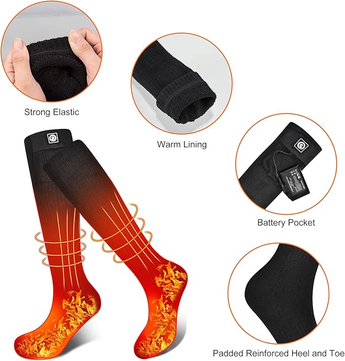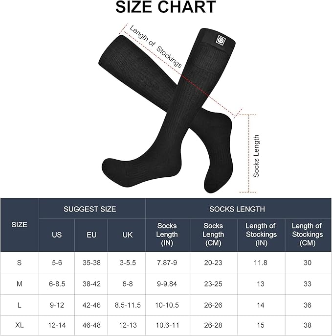 - 【Heating Elements Covers Instep and Toes Area】Rechargeable heated socks upgraded to use far infrared carbon fiber heating elements which can stimulate the blood circulation. Fast heating in 30 seconds, keep your feet warm and cozy.