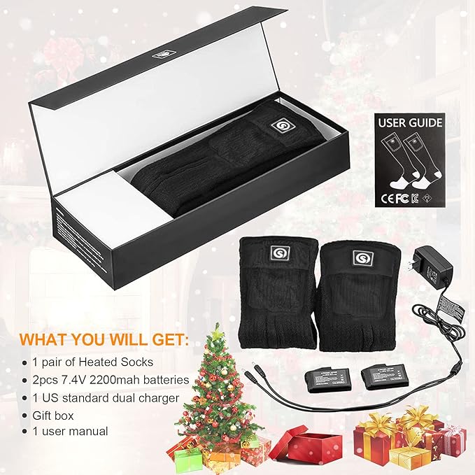 - 【7.4V 2200MAH Rechargeable Li-ion Batteries&Long Heating Hours】The Upgraded heated socks includes a pair 7.4V 2200MAH Li-ion rechargeable batteries. Battery full charge around 3-4 hours. Long-lasting heating, long life batteries, no longer afraid of the cold.