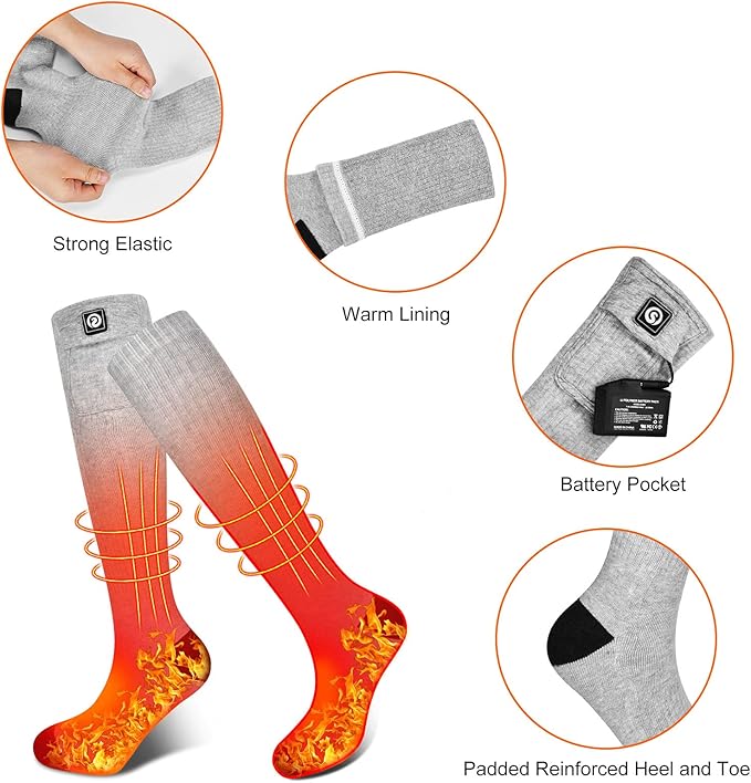 - 【Heating Elements Covers Instep and Toes Area】Rechargeable heated socks upgraded to use far infrared carbon fiber heating elements which can stimulate the blood circulation. Fast heating in 30 seconds, keep your feet warm and cozy.