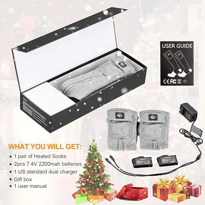 - 【7.4V 2200MAH Rechargeable Li-ion Batteries&Long Heating Hours】The Upgraded heated socks includes a pair 7.4V 2200MAH Li-ion rechargeable batteries. Battery full charge around 3-4 hours. Long-lasting heating, long life batteries, no longer afraid of the cold.