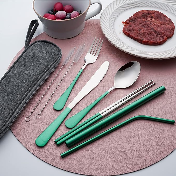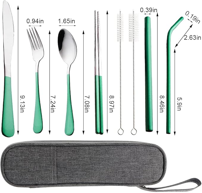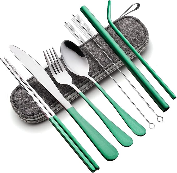 Travel Utensils with Case, Portable Travel Utensils Cutlery Set Stainless Steel Flatware Set for Camping 8pcs Including Dinner Knife Fork Spoon Chopsticks Boba Straw (Green)