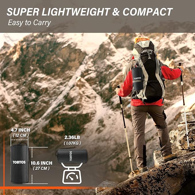 - Extra Thick Camping Pad: TOBTOS sleeping pad is wider and thicker than others on the market. It can be up to 6 in thick once full of air, which is our biggest advantage. It can stay away from the hard ground and sleep comfortably in any sleeping position
