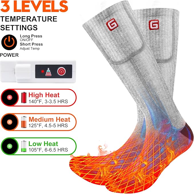 - 【3 Levels Temperature Settings Foot Warmer】The range of heat settings on these heating socks designed with 3 levels that you can choose depending on the weather. You can adjust these electric thermal socks to Low - Medium - High temperature mode(120℉-150℉).This battery powered socks are easy to use and operate - the indicator changes its color depending on a chosen level