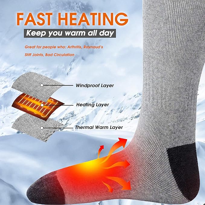 - 【Quick Warming Up Electric Heating Socks up to 150℉】Electric thermal warming socks designed with upgraded heating element inside,it can warm up quickly within 1 minute, help to stimulate your blood circulation,great for people with arthritis,raynaud's,bad circulation and stiff joints