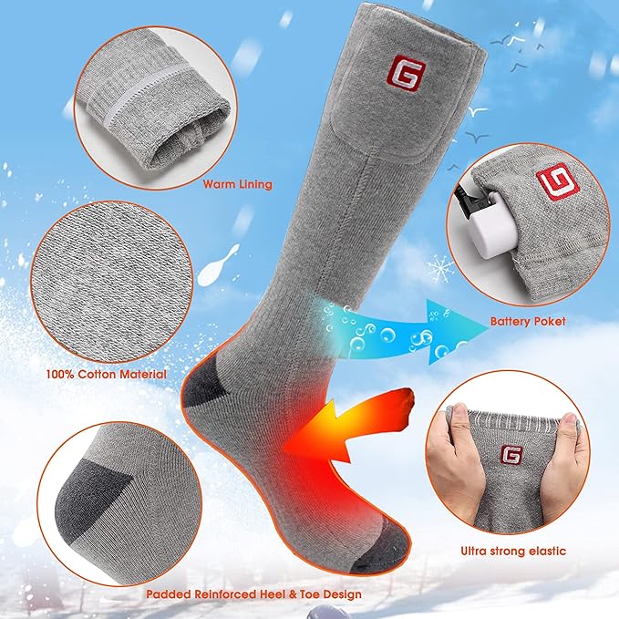 - 【Soft Breathable Insulated Material Thermal Socks】This warm winter socks made with Premium spandex fabric cotton,absorbent breathable,quick drying,elastic thickened,heat insulated and electric module using. Package including: A pair of heated socks, 2pcs batteries, 1pcs AC dual charger, 1pc user manual and luxury packing box for gift ideal