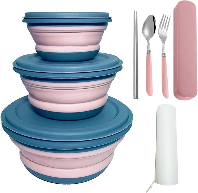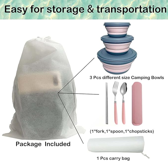 - 【What You Get 】A set of 3 collapsible silicone camp bowl with lid, 1 Pcs carry bag and a set of 3 Pcs foldable tableware(1*fork,1*spoon,1*chopsticks).Ideal for preparing or storing food.