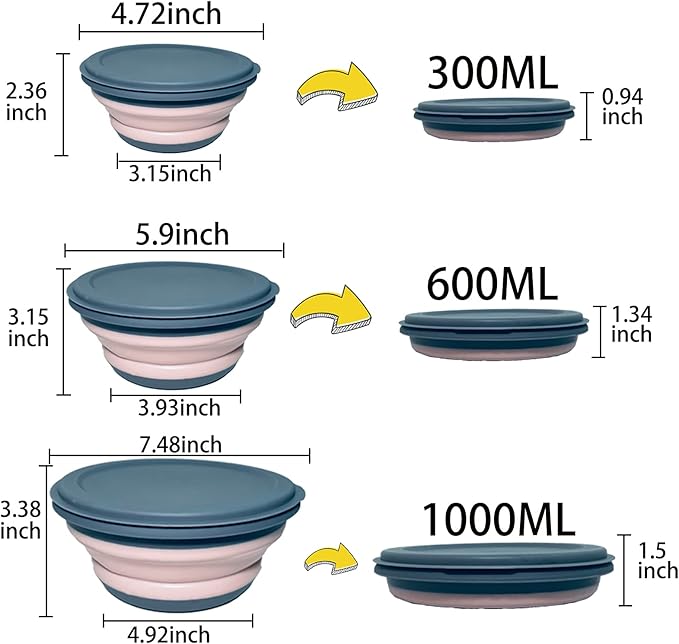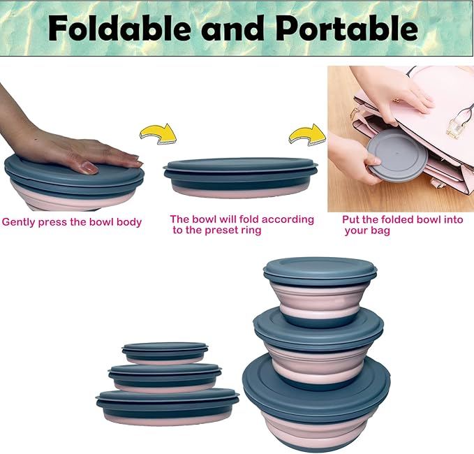 - 【Collapsible Design】This Food container can folds down to 1/3 of its original size. Fits well for a pocket, purse, backpack, suitcase , gloved storage and takes up no space. Perfect for camping trips, hikes, travels, picnics, hikes, outdoor events, offices, take with you everywhere, every day.