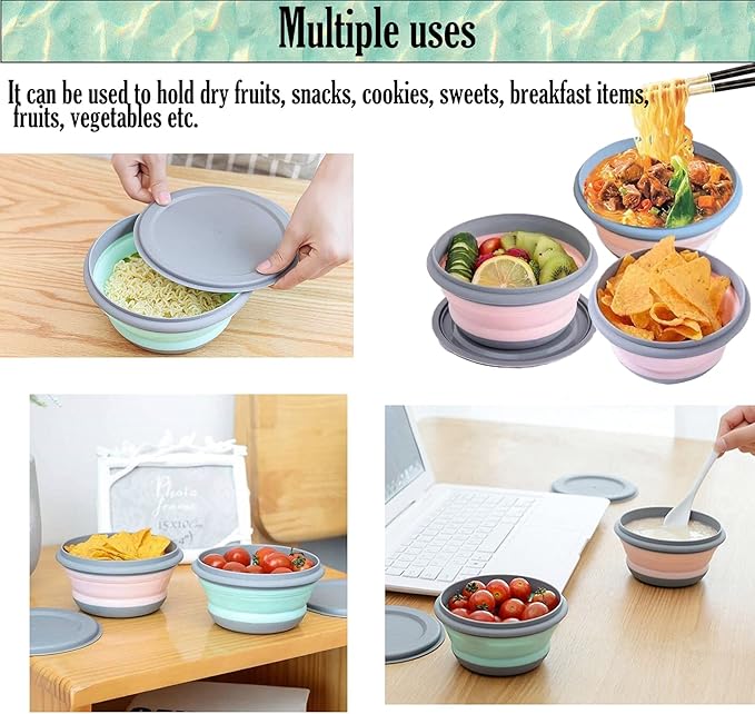 - 【Safe Material】RMAMSCOV Portable collapsible camping bowl is made of food grades silicone, BPA Free. It is odorless, environmentally friendly, durable, reusable, high temperature resistant and can be used for a long time.It can be used to hold dry fruits, snacks, cookies, sweets, breakfast items, fruits, vegetables etc. Great for the office, camping, road trips and more.