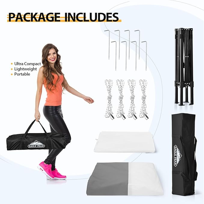 - EASY TO SETUP AND PUT AWAY: The EAGLE PEAK pop up system is more flexible and makes setup easy. The frame glides when opening and closing, enabling one person to easily open and close the canopy .