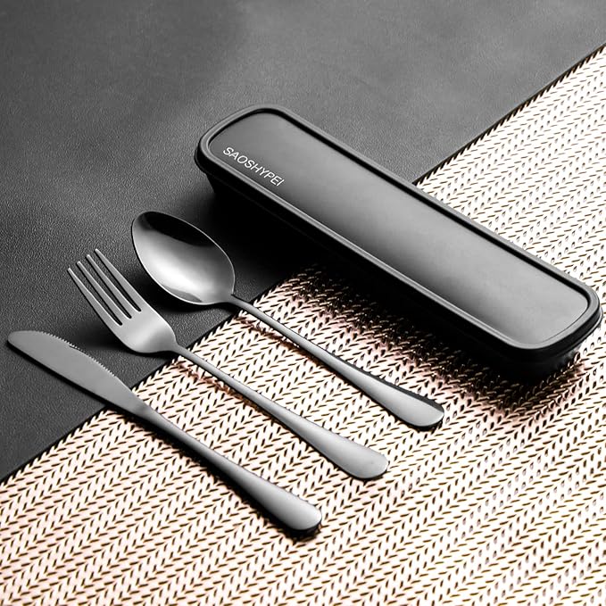 - 4-Piece Reusable Utensils with Case:includes 1 x dinner knife,1 x dinner fork, 1 x dinner spoon, plus 1 x travel flatware carrying case,suitable for restaurant, travel, camp, school or workplace...