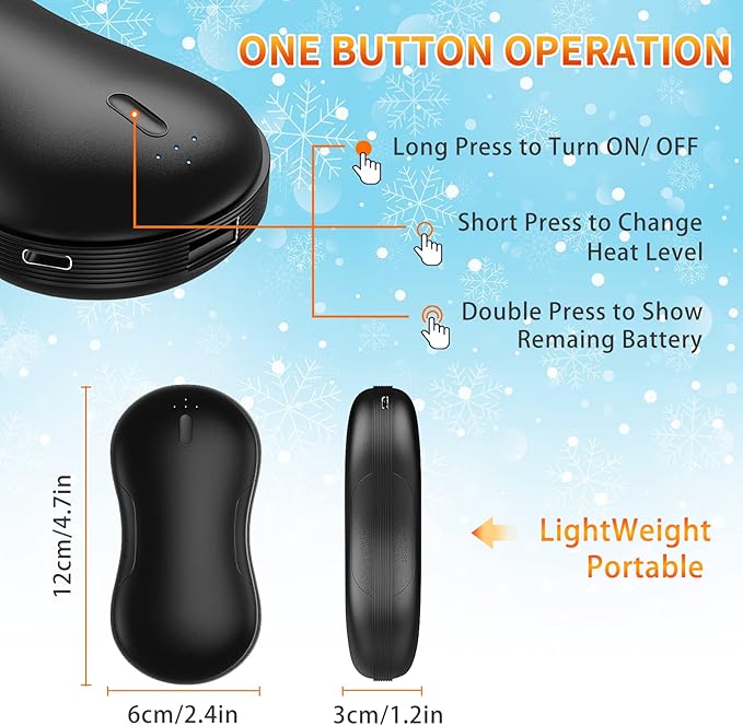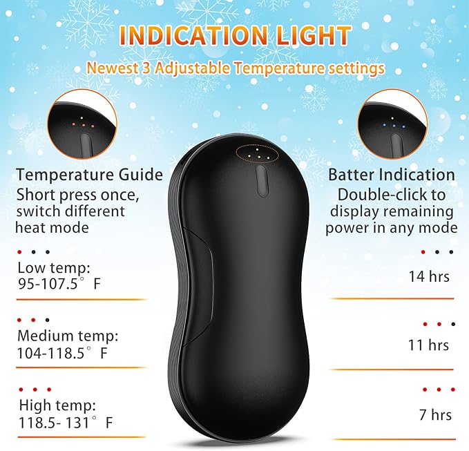 - 【Safe Long-lasting Heating】Safety is our priority, hand warmers made of high quality materials, shockproof, anti-scalding, explosion-proof, radiation-free, our hand warmers easy to use, only by a simple button, it has 3 levels of heat to choose, 131 °F (high), 118.5 °F (mid), 107 °F (low), it can be used about 7-14 hours.