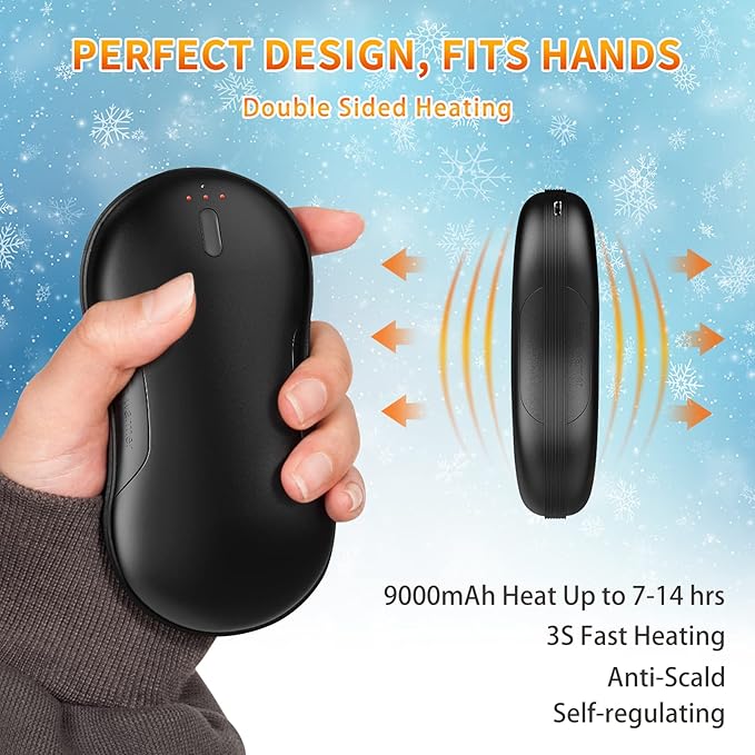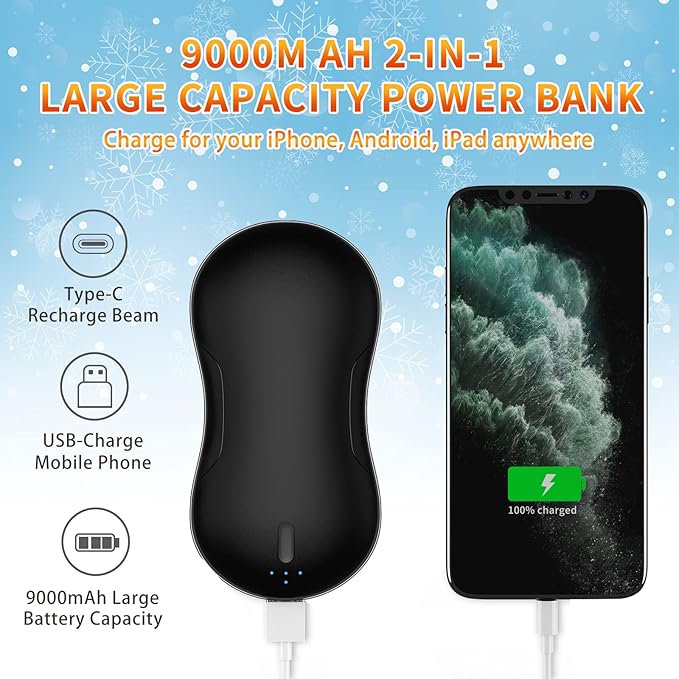 - 【 USB Rechargeable Battery】This hand warmers with 9000mAh large capacity, safe, reusable, power lasts longer and stronger than ever, It can be used as a power bank for Type-C, Micro Port devices.