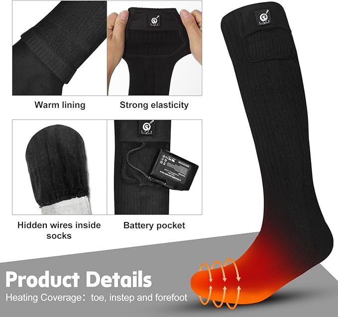 - Heating Elements Coverage: The far infrared fiber heating elements are strategically placed on the toe, instep and forefoot of the heated socks, which provides you with enough foot warmth, keeping you warm and toasty in the freezing temps.