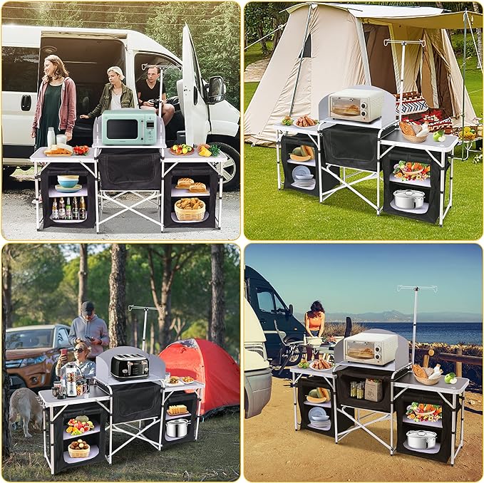 - 조명 스탠드와 윈드쉴드가 있는 주방 스테이션: 즐거운 시간을 보내고 싶으신가요? 이 올인원 주방 스테이션으로 요리를 즐겨보세요. 바람이나 빛 걱정은 이제 그만! 조명 스탠드에 조명을 걸고 알루미늄 윈드쉴드에 불을 세워보세요.