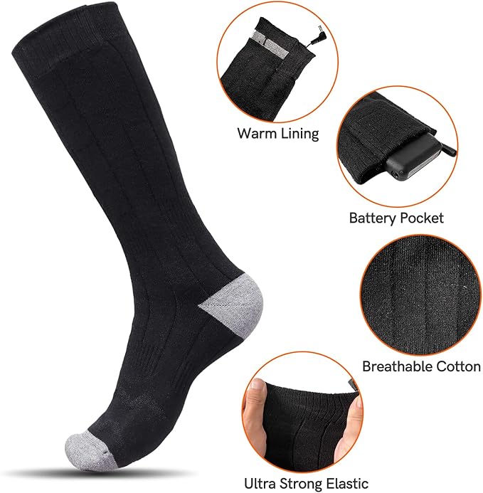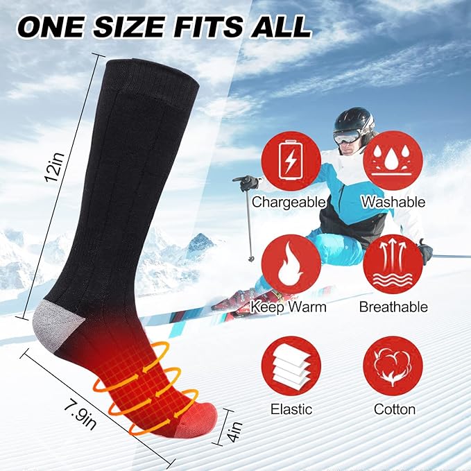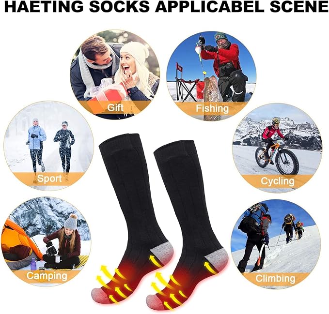 - 【Ideal Gift In Winter】Heated socks are given to your family and friends as winter ideal gifts, they will have a warm winter when taking part in outdoor activities. Package Included:1 Pair of Heated Socks, 2*Batteries, 1*AC Charger Cable, 1*Instruction. If you have any questions or any quality size problems, please contact us by email freely. we will more than happy to assist you ASAP within 24 hours.