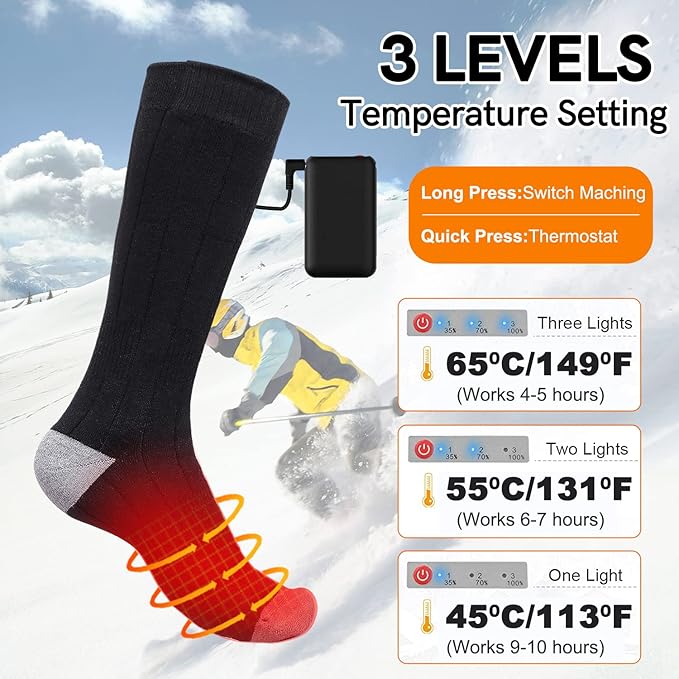 - 【Multiple Heating Methods】The winter warm rechargeable battery heated socks are designed with 3 heat settings, including high heat (65⁰C/149⁰F, 4 hours), medium heat (55⁰C/131⁰F, 6 hours), and low heat (45⁰C/113⁰F, 9 hours). You can rely on these heated boot socks to keep your toes comfortable no matter how cold it is.